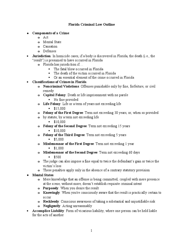 Florida Criminal Law Outline PDF Conspiracy (Criminal) Murder