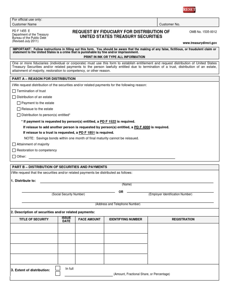 Forward the form to the treasury retail securities site at. The legal representative of the estate needs to complete a request by fiduciary for distribution of united states treasury securities (fs form 1455) showing distribution is being made to the person(s) entitled. • the trustee needs to complete a. Web one or more fiduciaries (individual or corporate) must use this.