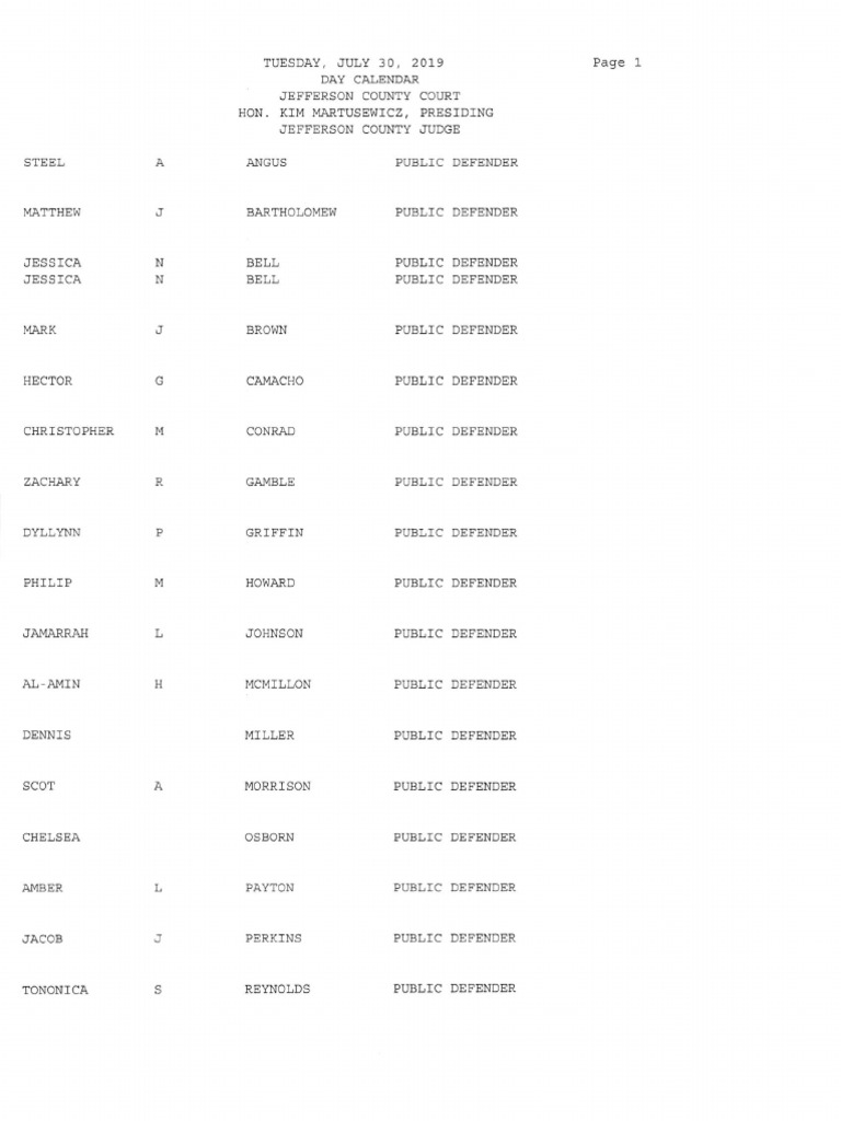 Jefferson County Court calendar July 30, 2019