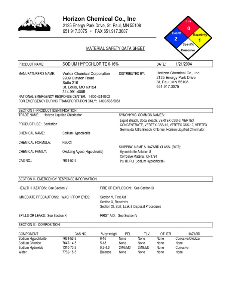 MSDS Sodium Hypochlorite Chlorine Dangerous Goods