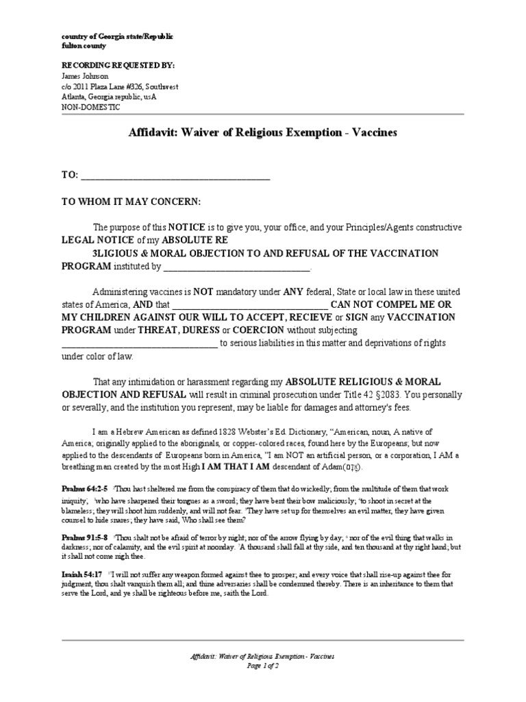 Affidavit Waiver of Religious Exemption Vaccines Politics Justice