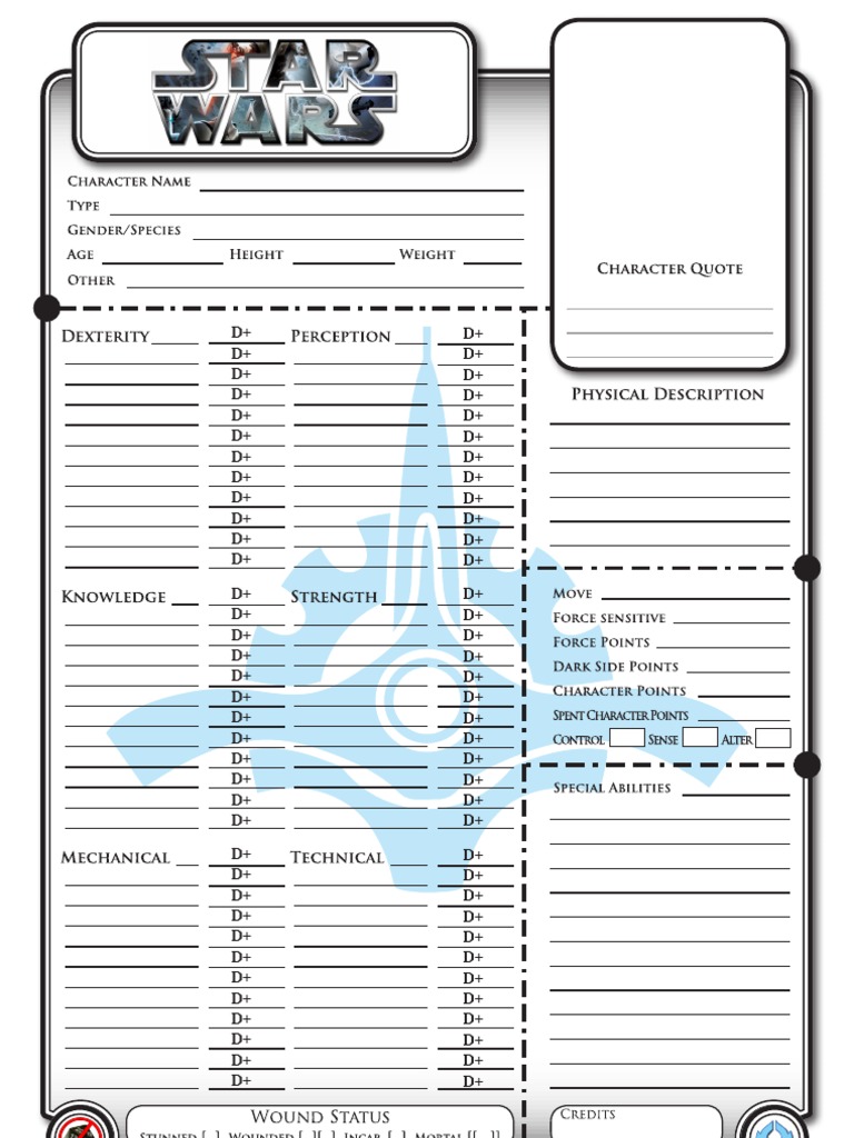 Web find official and alternative character sheets for star wars roleplaying game (swrpg) editions.