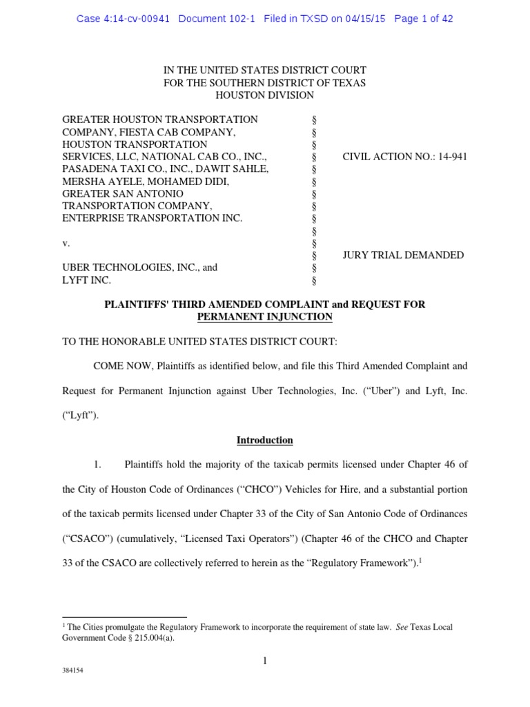 Third Amended Complaint against Uber Federal Court Houston Uber