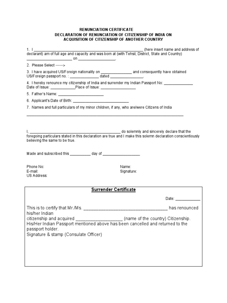 Under the indian citizenship act, 1955, persons of indian origin is not allowed dual citizenship. Web overview renunciation fees & documents required processing times overview surrender and renunciation of indian citizenship applies only to applicants of indian origin. 2) in criminal law, renunciation is abandoning a crime before it takes place. A defendant may use renunciation as evidence of his/her.